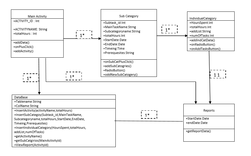 The database and the tables required for the application is created using the DataBaseHelper class. The attributes tableName and colName are used to define the name of the table and columns. The methods insertActivity( ) and insertSubCategory( ) are used to store the information about a main activity i.e., a course or project and it’s sub categories in the respective tables. The method insert indCategory( ) used to store data related to the sub tasks and hours spent on that sub category. The method getActivityName( ) fetches the names of all the courses added. getSubCategories( mainActivityId ) method gets the mainActivityId from the main activity and gets the sub categories which are related to that particular main activity. The method getsubCatId is used to get all the Id’s of the sub category table and viewReport( activityID ) get the data required to create a report on number of hours spent on a particular activity for a specific duration of time.
