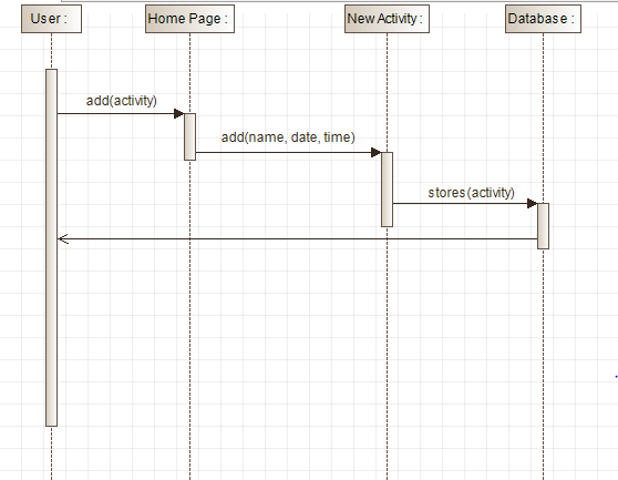 Above interaction diagram describes about adding an new activity in our app. Process starts when user enters the home page, when user enters 'add activity'. Then user adds his/her activity name, date and time. Finally it stores in database.