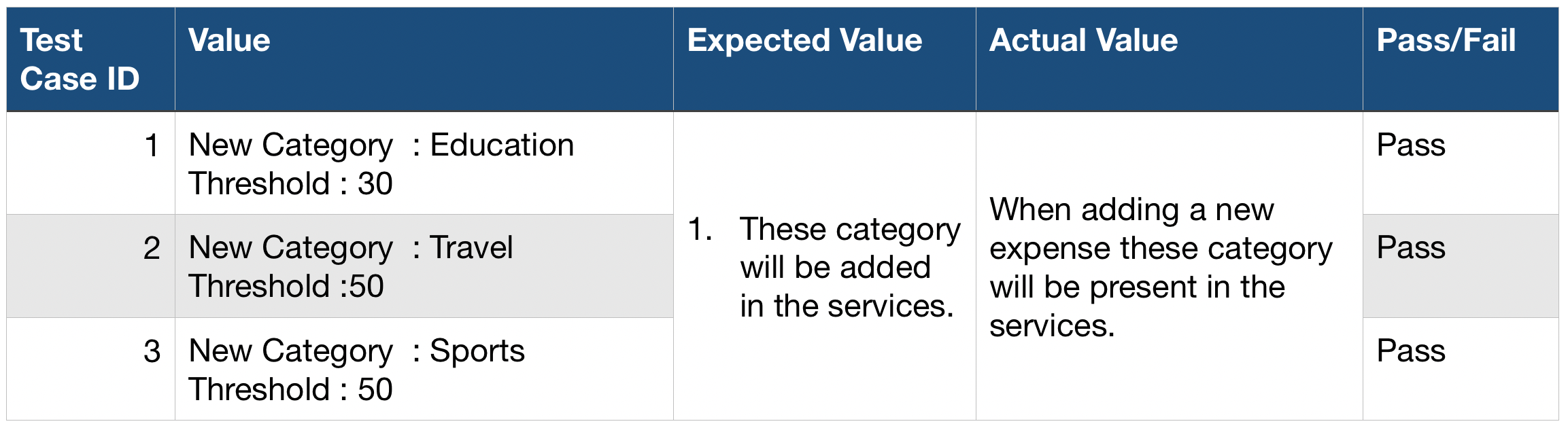 - For each new account creation, there is a user categories table created containing two columns.One that holds all of the categories’ names and second one for holding the amount of money set as threshold for the specific category. There is a default value of 50.0 money units set as limit for the five basic categories. Of course, the user can add a new category or modify one that doesn’t exist by changing the threshold set for it.