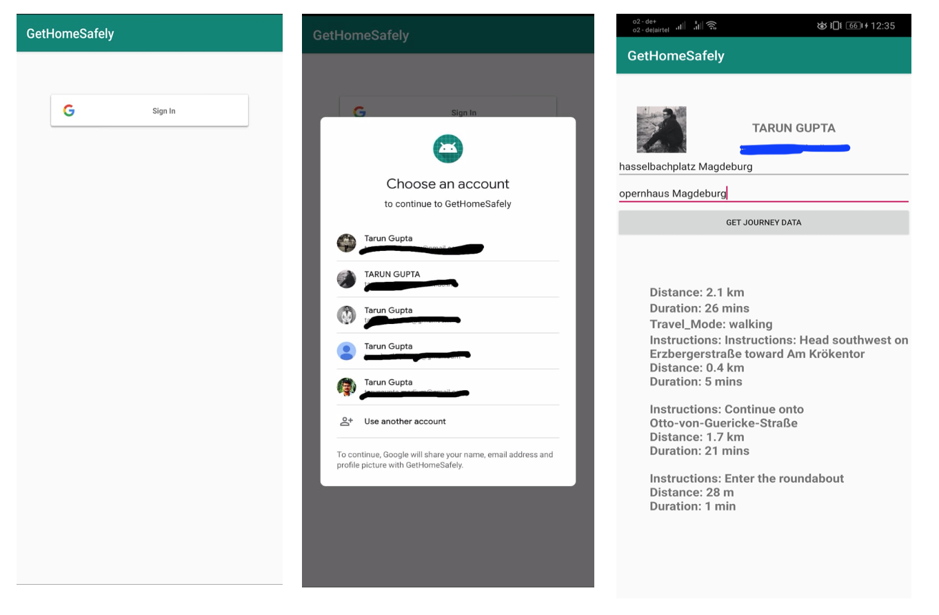 The data shown below the search fields is step by step description of how to reach from source to destination, how much is the distance and what time will it take to complete the journey. The data shown on top is retrieved from Google SignIn API.